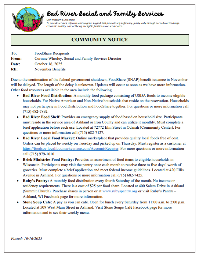 Questions about FoodShare can be directed to Wendy Corbine at (715) 682-7127 or fep@badriver-nsn.gov.