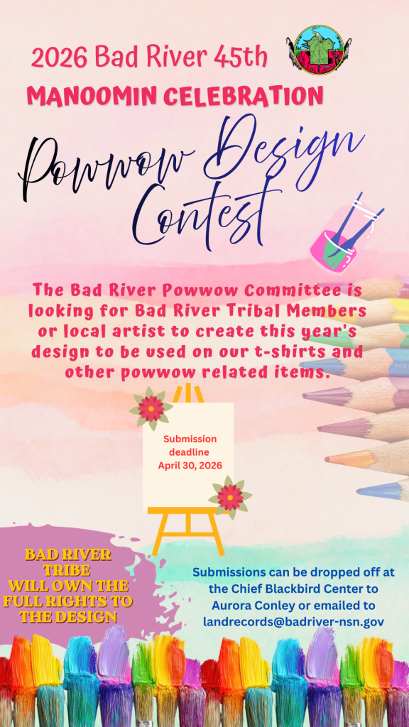 The Bad River Powwow Committee is excited to announce the 2026 Bad River 45th Annual Manoomin Celebration Powwow Design Contest!