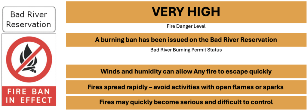 There are times of the year when fire danger rises, or certain weather conditions occur that make burning dangerous. Section 8 of the Burn Ordinance allows the Bad River Fire Warden to declare a burning ban. When a burning ban occurs, posters will be displayed at the usual bulletin boards across the community and posted on the Bad River Natural Resource Department website.