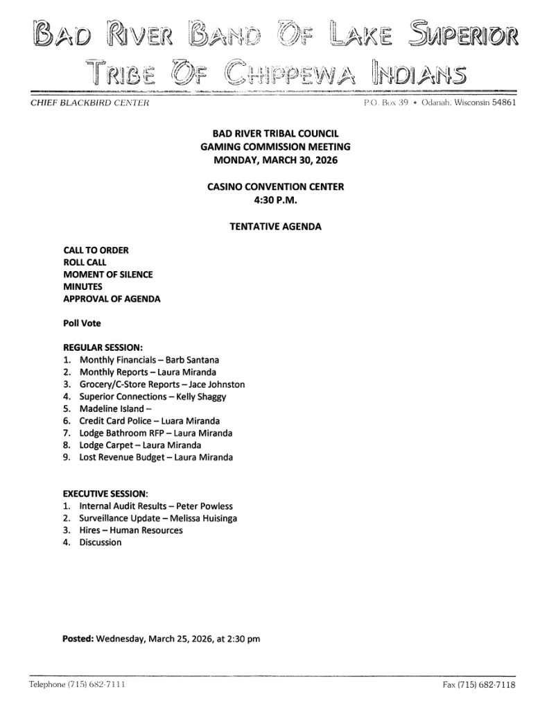 | Secretary | Laura Miranda | BRTSecretary2@badriver-nsn.gov | 715-292-5536 |