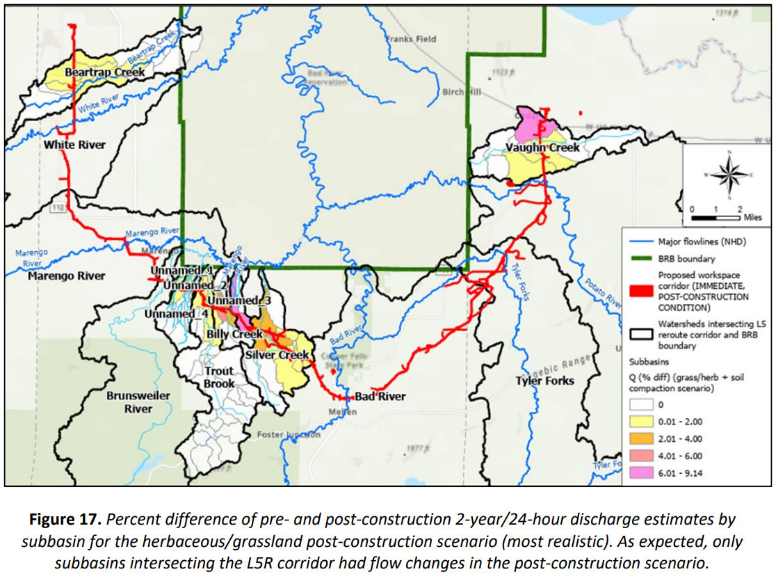 - Map: Modeled increases in runoff by subbasins due to the reroute project construction (WWE 2025)