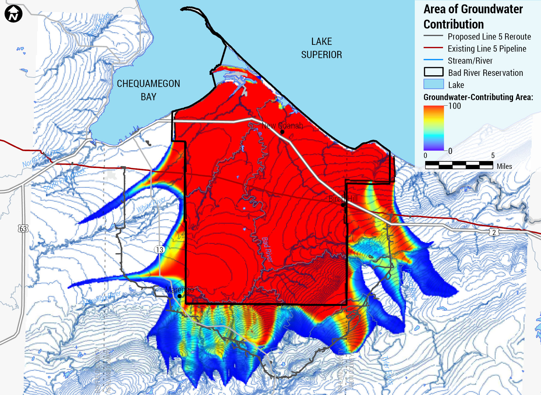 - Map: Modeled results of where groundwater flow contributes to aquifers on the Bad River Reservation (LimnoTech 2025)