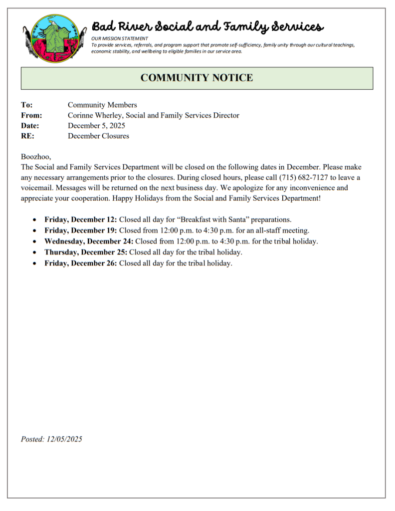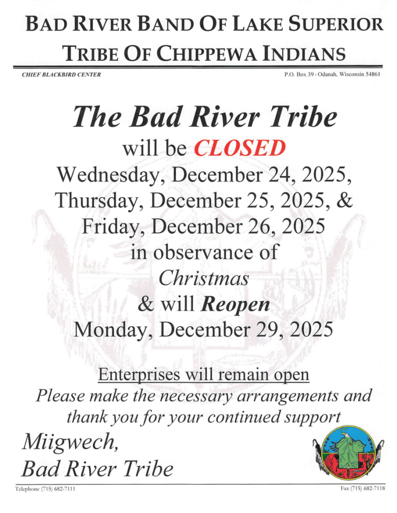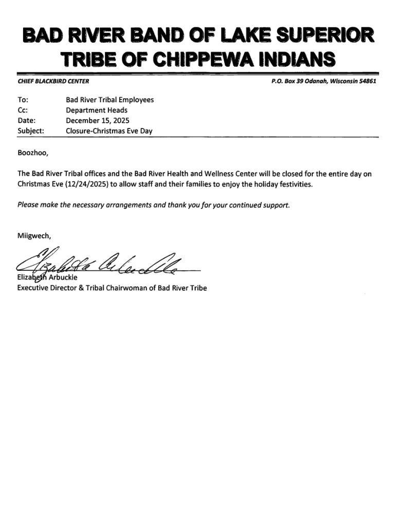 Sign-Up for by emailing: NewsLetter@badriver-nsn.gov